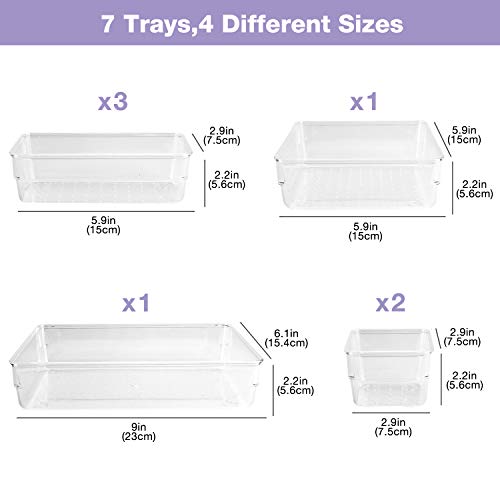 Puricon 7 uds. Organizadores Transparentes para Cajones, Cajas Plásticas de Almacenamiento, Bandejas de Maquillaje Papelería Cubiertos para Dormitorio Vestidor Cuarto de Baño Cocina Oficina Escritorio
