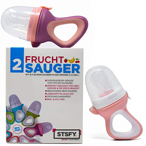 - ??? TODO LE QUE EL BEBÉ NECESITA: 2 Chupetes para Frutas con un total de 6 Tetinas de Silicona suaves sin BPA en 3 Tamaños diferentes adecuados para la edad de bebés de 3 a 24 meses - ideal en el hogar y en camino.