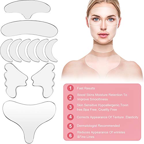- Juego de almohadillas de silicona para el pecho: obtenga una cara más suave y encantadora, un escote más joven, pecho y cuello con estas almohadillas adhesivas de silicona; El conjunto incluye un parche de silicona reutilizable en el pecho, una almohadilla para el cuello, una máscara para los ojos, un pómulo y una almohadilla para la frente