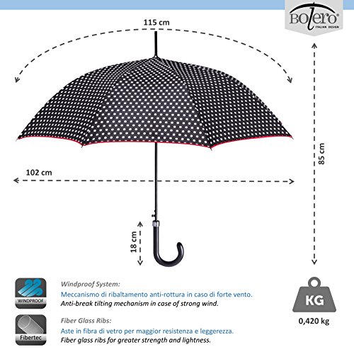 BOLERO OMBRELLI - Paraguas de lluvia largo clásico antiviento y automático de alta calidad - Apertura automática - Tejido Pongee 190T - Hombre mujer Bianco & Nero H: 85 cm. Ø: 102 cm