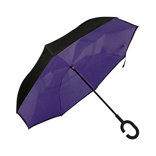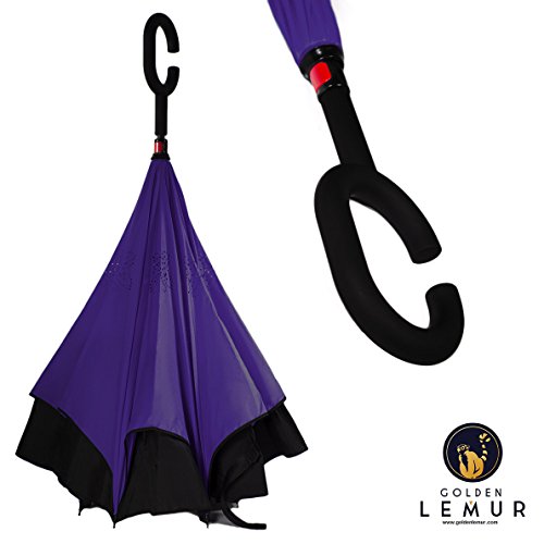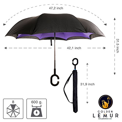 Golden Lemur Paraguas Invertido. Paraguas Originales Mujer y Hombre de Colores. Grande, para Coche Antiviento. Doble Capa, Reversible, Abre al Revés, Asa Manos Libres Funda Garantia Calidad Morado