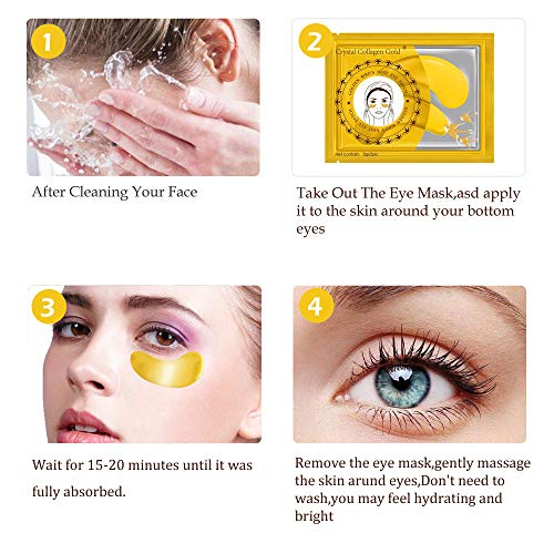 - Máscara de ojo de oro 24K - El oro de 24k se usa ampliamente como un lujoso ingrediente para el tratamiento de la piel en los mejores spas de todo el mundo. La ayuda activa de 24K GOLD expulsa naturalmente toxinas dañinas, aumenta la circulación sanguínea y estimula las células de la piel, agregando frescura y brillo a la piel opaca.