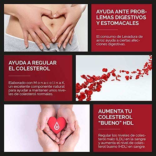 - SALUD Y COLESTEROL SANO – La levadura de arroz rojo tiene propiedades para bajar el colesterol alto ya que posee monacolina K, sustancia inhibidora de la HMG-GoA reductasa, enzima que controla la producción de colesterol y disminuye su cantidad en sangre cuando es necesario.