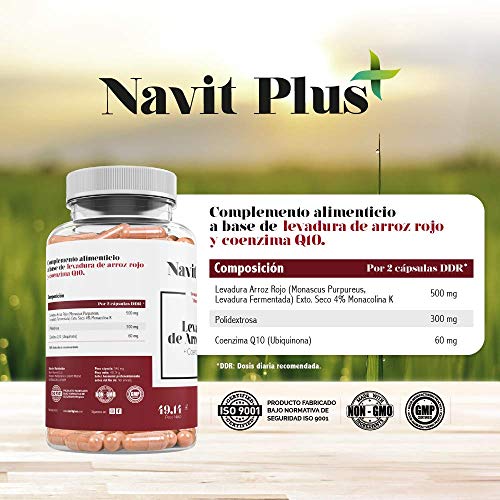 - NUESTRA LEVADURA ROJA DE ARROZ: En Navit Plus, únicamente trabajamos con principios activos naturales y de primera calidad. Por eso nuestra levadura de Arroz Rojo es de ORIGEN NATURAL, aportando la mayor cantidad por cápsulas que encontrará en el mercado. (250mg), cuyo contenido de Monacolina K, es de 10 mg por cápsula. Además, combinamos nuestra levadura de arroz con COENZIMA Q10, cuya cantidad por cápsula es mucho mayor que la media, siendo esta de 30 mg.