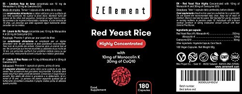 - ALTAMENTE CONCENTRADA. Dosis de 10 mg de Monacolina K por cápsula, para mantener niveles normales de colesterol sanguíneo. 180 cápsulas por envase, más que la competencia.