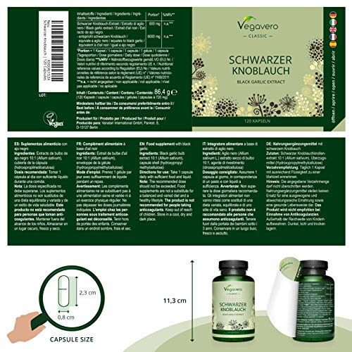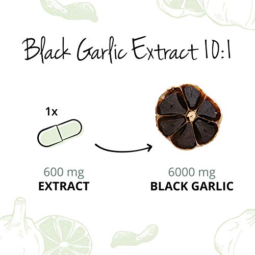 - ? DOSIS ALTA Y SIN OLOR: Cada cápsula contiene 600 mg de un extracto de ajo negro fermentado de alta calidad (10:1) que equivale a 6000 mg de polvo de ajo negro. Durante el proceso de fermentación se reduce el contenido de alicina, lo que finalmente elimina el típico sabor del ajo. Además, nuestras cápsulas de ajo negro no causan el típico aliento a ajo (halitosis).