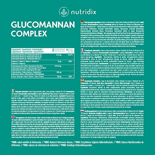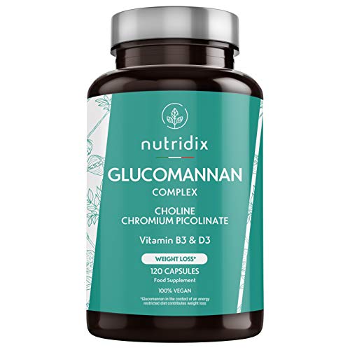 Glucomanano Konjac - 3150mg por dosis - Ayuda a Adelgazar en Dietas Bajas en Calorías - Glucomanano Natural con Cromo, Colina, Vitamina D3 y B3-120 cápsulas Nutridix