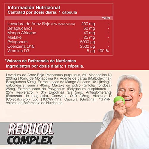 Reductor del Colesterol | Reduce y Mantiene en niveles sanos tu Colesterol | Levadura de Arroz rojo + Coenzima Q10 + Resveratrol + Mango Africano + Vitamina D | Fórmula Natural 100% eficaz | 60 Caps.