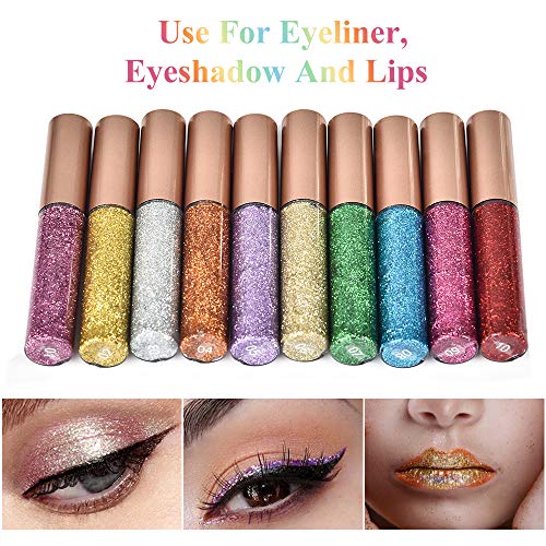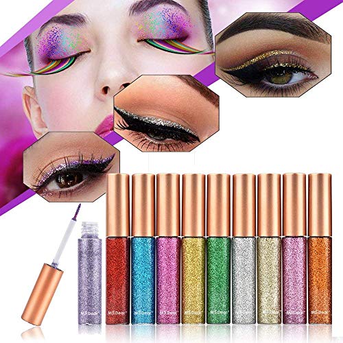 Delineadore de Ojos Purpurina Eyeliner, MS.DEAR 10 Colores Eyeliner Glitter Liquid Sombra, Impermeable Eyeliner Shimmer Pigmento Lápiz de Color Metalizado Líquido Glitter Eyeliner
