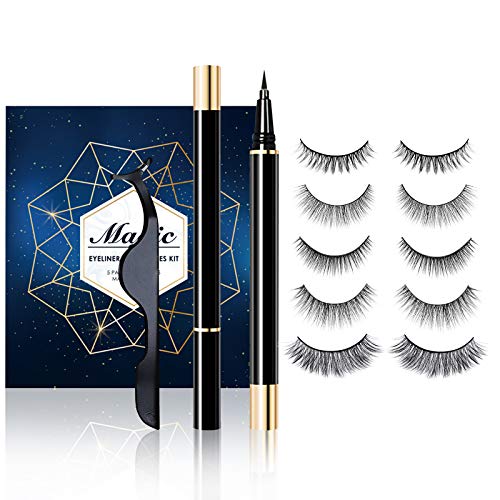 Pestañas Magneticas Delineador,3D Pestañas Postizas Magnéticas Reutilizables Kit Pestañas Eyeliner Magnetic Eyelashes con Rizador No se Necesita Pegamento (5 pares)