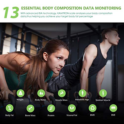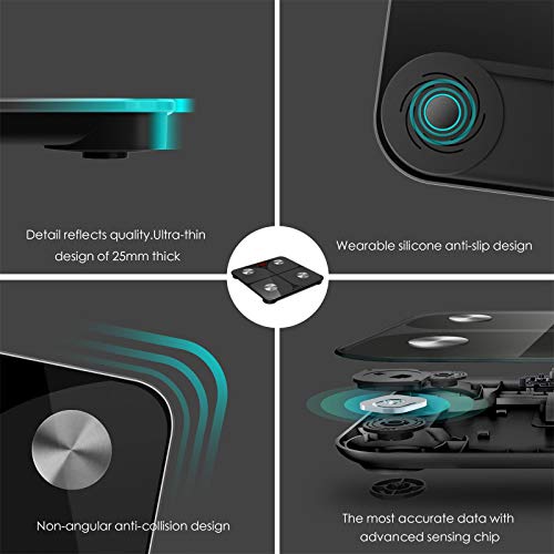 - ?? -[12 Medidas esenciales]Bascula baño con tecnología BIA para medir con precisión su información física incluyendo el Peso corporal, Porcentaje de grasa corporal, Hidratación, IMC(BMI), BMR(KCAL), Grasa visceral, Músculo esquelético, Masa muscular, Masa ósea, Edad corporal, Edad metabólica, Proteínas. Le permite rastrear el impacto de programas de entrenamiento y programas de pérdida de peso para usted