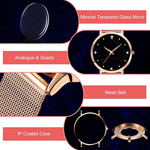 Relojes de Cuarzo analógicos para mujer niña de Agua 3ATM con Correa de Malla de Acero Inoxidable en Oro Rosa, Reloj de Pulsera con Elegante Esfera Azul y Cielo Estrellado