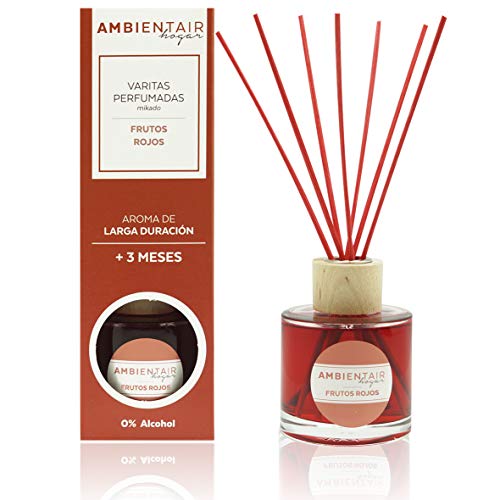 Ambientair Hogar. Difusor de Varillas perfumadas. Ambientador Mikado Frutos Rojos. Difusor 50 ml con palitos de ratán. Ambientador sin Alcohol para casa.