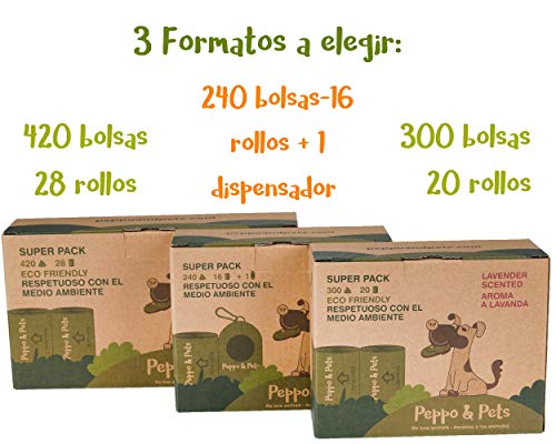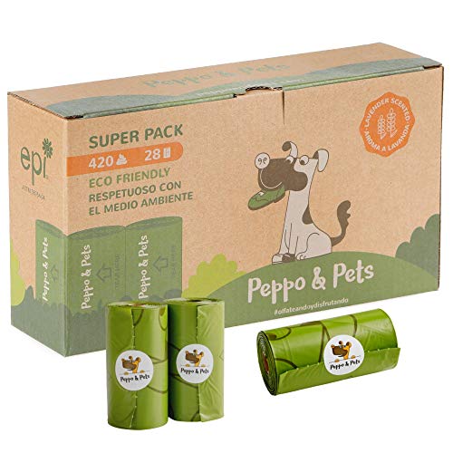 Peppo and Pets- 420 Bolsas biodegradables para excrementos de Perro -(28 Rollos) - Muy Resistentes - Olor a Lavanda- Opacas- A Prueba de Fugas
