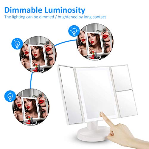 Espejo Maquillaje,WEILY Espejo Cosmético,Luz ajustable con LED,Tríptica Aumentos 1X, 2X, 3X, Rotación ajustable de 180 °, fuente de alimentación doble, espejo cosmético encimera