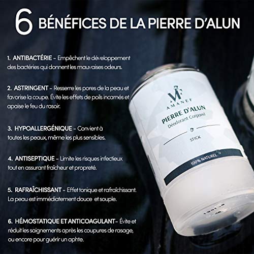 - ✔️ INGREDIENTE 100% PURO Y NATURAL – La piedra de alumbre Amanef es un desodorante eficaz que utiliza sales minerales naturales. Proporciona protección diaria contra los olores corporales. No contiene clorhidratos de aluminio, parabenos y alcohol. Apto para todo tipo de pieles.