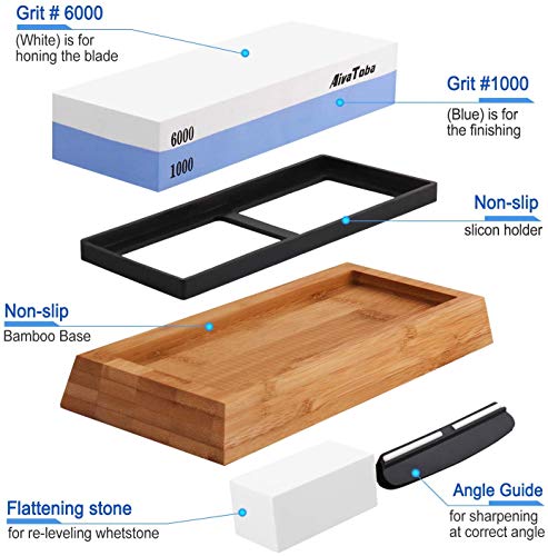 - ?【Seguridad】La base de silicona que sostiene la piedra dentro de la base de bambú antideslizante, esta configuración asegurará que la piedra se FIJA EN UN SOLO LUGAR mientras se afila. Y la guía del ángulo de afilado de cuchillas le permite mantener un ÁNGULO CORRECTO y aplicar de manera segura una presión constante mientras afila la cuchilla