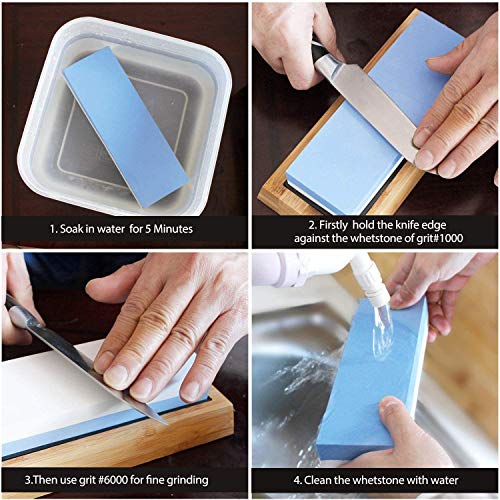 - ?【Piedra de afilar 2 en 1】① Lado grueso (grano 1000) para afilar la cuchilla, afila rápidamente cuchillos desafilados o dañados, y hace que la muesca y la falla se aplanen; ② Fine lado (grano 6000) para terminar y pulir la cuchilla para afilar los bordes