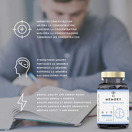 - ?MEJORA LA MEMORIA, POTENCIA EL RENDIMIENTO MENTAL Y LA CONCENTRACIÓN: El Suplemento Natural Memoria solo tiene ingredientes Naturales como Ginko Biloba, Bacopa, Cafeína, Té Verde, Reishi, y Vitaminas del grupo B, que pueden ayudar a Aumentar las Capacidades Cognitivas. El Ginko Biloba Estimula la Actividad Cerebral, mientras que la Bacopa Monnieri destaca por la mejora de memoria, concentración y aprendizaje.