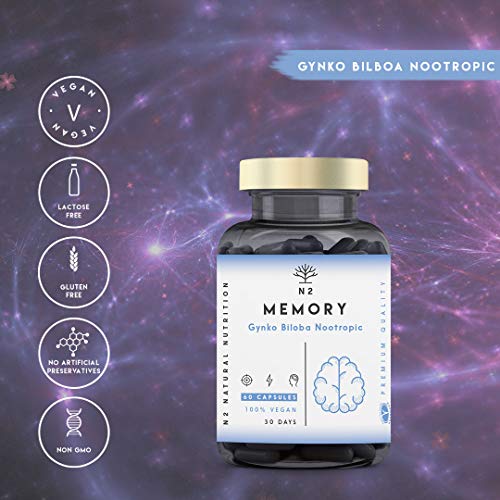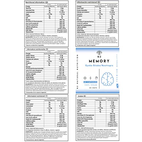 Nootropico, Cafeina, Bacopa, Ginko Biloba, Vitamina B6, B12. Mejora Memoria, Concentración. Reduce Estrés, Cansancio Mental, Fatiga. Adaptógeno, Antioxidante. Vegano, 60 cápsulas. N2 Natural Nutrition