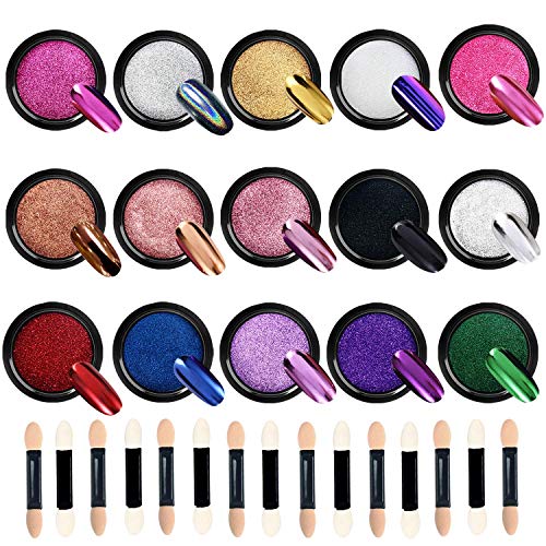 WANXIAN Polvos para uñas 15 frascos Cromo en polvo para uñas Uñas metálicas en polvo Brillos Manicura Art Power Sets con 15 piezas de palos de sombra de ojos, 1 g/frasco