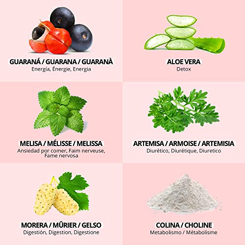 - Efecto FAT BURNER TRIPLE ACCIÓN: estimula (Aloe vera), activa (Guaraná) y mitiga la ansiedad por la comida (Melisa).