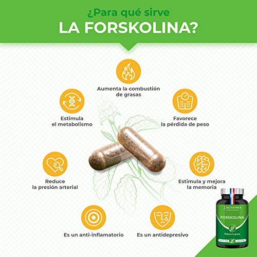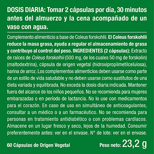 - FORSKOLIN PURO : Pierde de peso de manera saludable con Forskolina quema grasa que contiene Extracto Puro de Raíz de Coleus Forskohlii + Forskolin llamada hormona sensitiva lipasa, que Elimina la Grasa Corporal. Potentes Cápsulas Adelgazantes formulada con extracto de Forskoline, mucho mas concentrado que los famosos The de dieta quemagrasas.