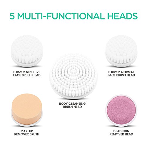 - ✅ 5 CABEZALES DE CEPILLO FUNCIONALES: con 5 cabezales de cepillo diferentes para sus diferentes necesidades: 1x cabezal de cepillo facial de 0.08 mm para piel normales, 1x cabezal de cepillo facial de 0.06 mm para piel sensible, 1x cabezal de cepillo de limpieza corporal, 1x cabezal de cepillo desmaquillante, 1x cabezal de exfoliación de piel muerta.