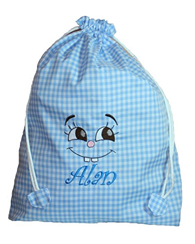 PRIMERAEDAD/Bolsa multiusos de tela en cuadros vichy (35 x 45 cm) personalizada con nombre/COLOR CELESTE-BLANCO).