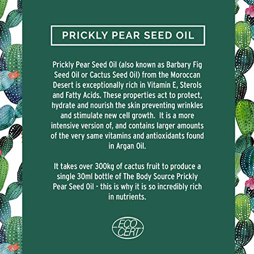- RICO DE VITAMINAS Y SUSTANCIAS NUTRITIVAS: El aceite de las semillas de nopal, comparado con el de argán, es más rico en vitamina E (tocoferoles) y ácido linoleico, mientras que es más ligero. Esto lo hace perfecto para la absorción por la piel. De hecho, es tan increíblemente rico en nutrientes que producir una sola botella de 30 ml de aceite de pera espinosa de The Body Source es de 300 kg de fruta.