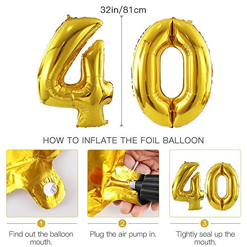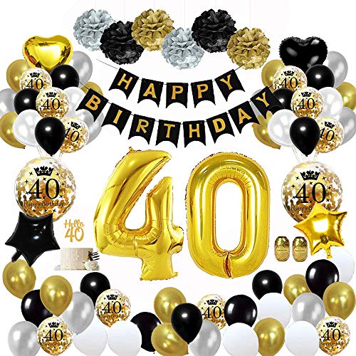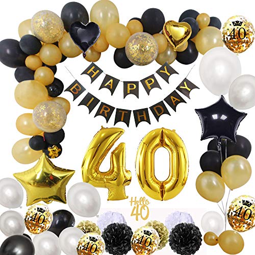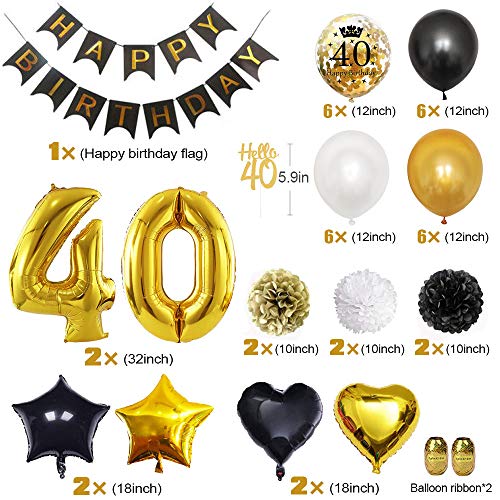 - ?【Conjuntos de decoraciones de cumpleaños】 - El conjunto incluye: 1 conjunto de pancarta de feliz cumpleaños (13PCS), pompones de papel de 10 pulgadas (6 piezas), globo digital de 32 pulgadas 40(NOTA IMPORTANTE: el globo digital de 32 pulgadas 40 no puede volar en el aire después del inflado), globos de 24 piezas (Incluye 6 piezas de globo de confeti), 4 piezas de globos de aluminio, 1 pieza de "HELLO 40", adorno de torta, 2 cuerda.