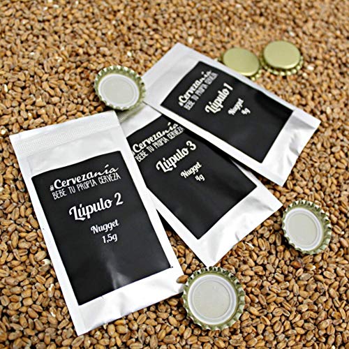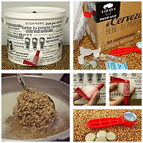 - ⚒️ ¿Qué incluye el kit? Mix de maltas de cebada molida 1400g.; 3 sobres de lúpulo 9.5g.; 1 sobre levadura ale 3g.; sanitizer 8g.; 21 chapas corona 26mm.; chapadora de martillo; cubo fermentador con tapadera, grifo y juntas; airlock; termómetro digital; manual de instrucciones.