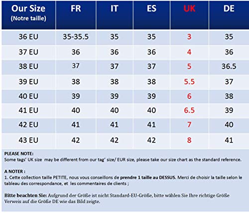 - Tabla de tallas:37 EU = 36 tamaño ES,38 EU = 37 tamaño ES,39 EU = 38 tamaño ES,40 EU = 38.5-39 tamaño ES,41 EU = 39.5~40 tamaño ES,42 EU = 40.5~41 tamaño ES,43 EU = 41.5~42 tamaño ES