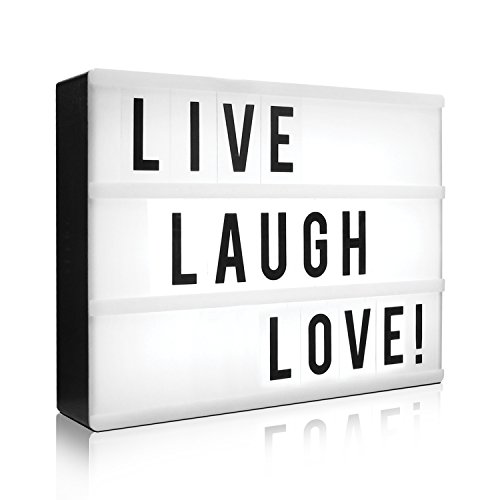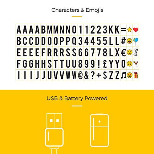 - CAJA LUMINOSA: Caja de luz cinematográfica en formato A4 con 100 letras, emoji y símbolos y 3 líneas para el texto. Funciona con el cable USB de larga duración para la carga o puede ser operado por baterías AA. Además, cuenta con brillantes luces LED blancas de bajo consumo para una iluminación super uniforme.