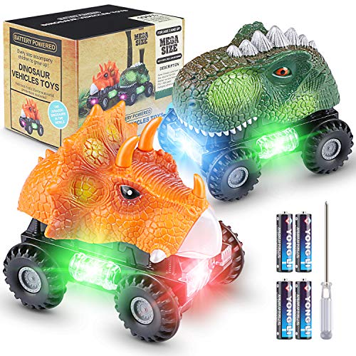 Magicfun Dinosaurio Coche, 2 Coches de Juguetes de Dinosaurios con Luces LED y Sonidos, T-Rex Dino Cars Monster Trucks de PlƔstico sin BPA, Regalo para NiƱos NiƱas 3-8 AƱos