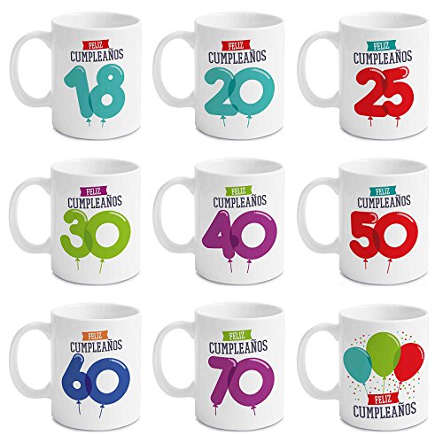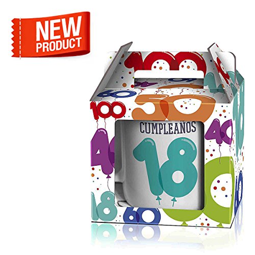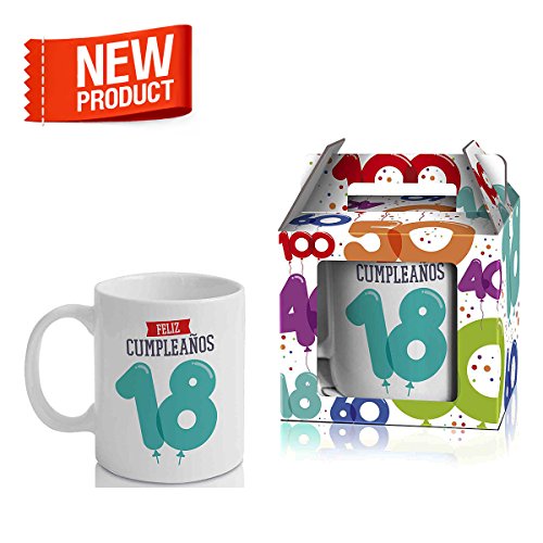 Taza Cerámica para Desayuno en Color Blanco de 300 ml, Un Regalo Original para Aniversarios - "Feliz 18 Cumpleaños"