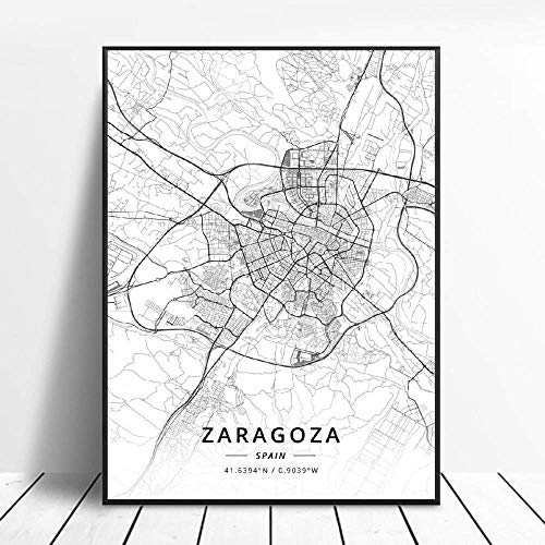 Impresiones Sobre Lienzo Zaragoza España Blanco Y Negro City Art Canvas Poster Moderno Simple Retro Art Latitud Longitud Imagen Decoración Del Hogar Póster De Impresión Hd,Para Sala De Estar Dormi