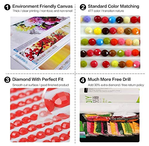 - Material respetuoso con el medio ambiente: Material: lienzo de pintura al óleo transparente que es engrosada e impermeable, el patrón con el fondo que el lienzo es impermeable y tiene textura uniforme, con cubierta de película transparente para mantener la imagen pegajosa y luego mantener los diamantes en su lugar, así proteger la imagen. Es como punto de cruz y pintura por números, los símbolos son claros y fáciles de leer.