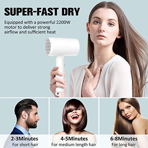 - 【Con Gran Motor con Potencia de 2200W para el Secado Rápido】 Gracias a que está equipado con un motor de larga duración de 2200W y al sistema inteligente de reducción de ruido incorporado, consiguen que este secador pelo ionico sea muy potente y con un bajo nivel del ruido, con un flujo de aire fuerte que le ofrece el suficiente calor. Podrá secar el cabello corto en 2-3 minutos, cabello de longitud media en 4-5 minutos, y cabello largo en 6-8 minutos