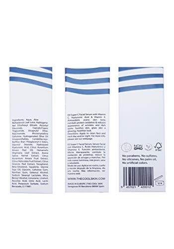 The Cool Skin - Super C Facial Serum NATURAL y VEGANO con ÁCIDO HIALURÓNICO + VITAMINA C + VITAMINA E + ALOE VERA. Antiedad, Potente Antioxidante, Hidratante. 50ml Tamaño Grande