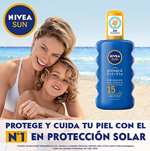 NIVEA SUN Protege & Hidrata Spray Solar FP15 (1 x 200 ml), protector hidratante y resistente al agua con protección UVA/UVB, protección solar media