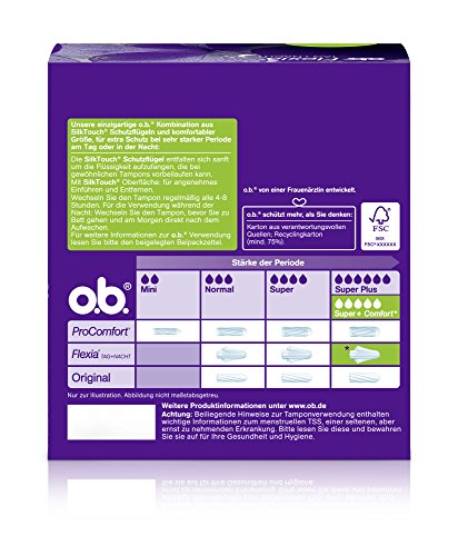 o.b. Tampones flexibles para día y noche Super+ Comfort para una protección extra contra deslizamientos y deslizamientos durante el día o la noche. Con alas protectoras SilkTouch únicas.