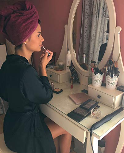 - El práctico turbante está disponible en varios colores, como blanco, burdeos y gris. Al estar realizado en algodón, resulta muy absorbente, por lo que el cabello mojado se seca de manera rápida y sin incómodas gotas de agua.
