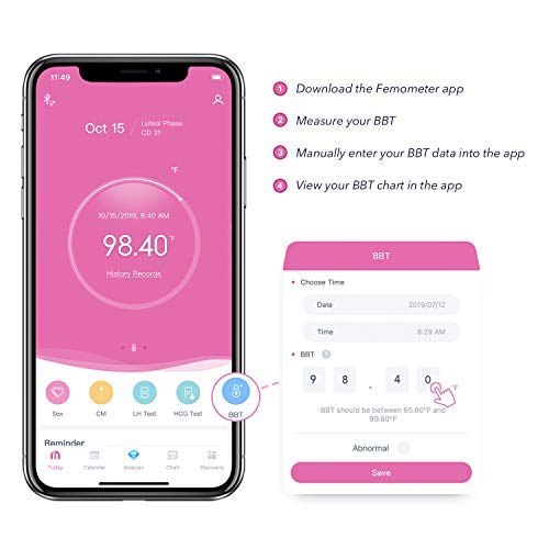 - ?Gráfico inteligente y automático: use la App Femometer (para iOS y Android), para registrar los datos de la temperatura basal. La aplicación dibujará automáticamente la gráfica de su temperatura basal y marcará el día de su ovulación. Respetamos la privacidad de sus datos. (NOTA: Esto no es un producto Bluetooth. Debe introducir manualmente la temperatura en la App).