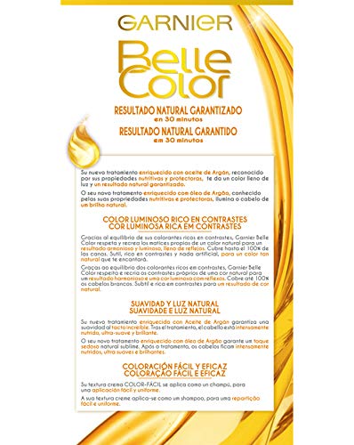 - Garnier Belle Color proporciona una coloración de aspecto natural y cobertura completa de canas gracias a su fórmula con aceite de jojoba y germen de trigo