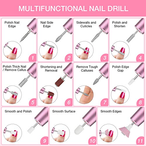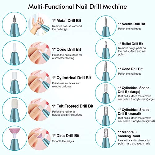 - ă11 Accesorios Profesionales ă Esta manicura lleva 11brocas , 24bandas de lijad,1 cepillo de uñas .Es una mĂĄquina de taladro de uñas multifuncional para esmerilar, tallar, cortar, dar forma, pulir, eliminar gel y eliminar callosidades. Es adecuada para el salĂłn de uñas, salĂłn de belleza, manicura personal y pedicura,etc.