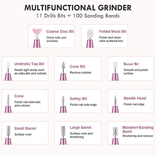 - ăKit de taladro de uñas profesional actualizadoăDiseñado con 11 piezas de brocas de 3/32 â y 106 piezas de bandas de lijado, multifuncional para esmerilar, tallar, cortar, pulir, eliminar el esmalte de gel y las cutĂculas para uñas acrĂlicas y uñas naturales.