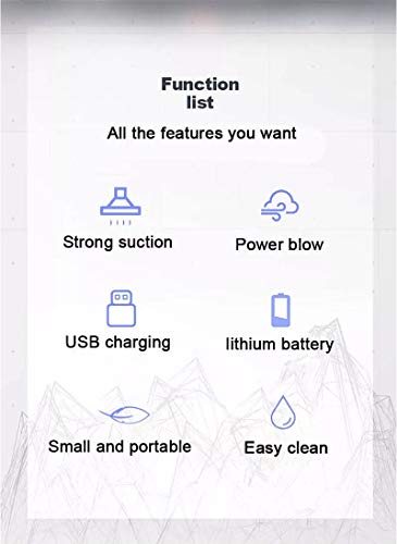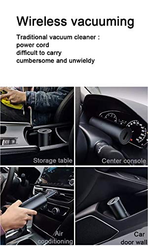 - "Limpio y sin puntos ciegos: la aspiradora para automóvil está equipada con boquillas en 3 áreas diferentes para satisfacer todas sus necesidades de limpieza. Limpia áreas difíciles de alcanzar. Tales como huecos y callejones sin salida, Y absorba toda la basura, incluido el polvo y el cabello difíciles de manejar"