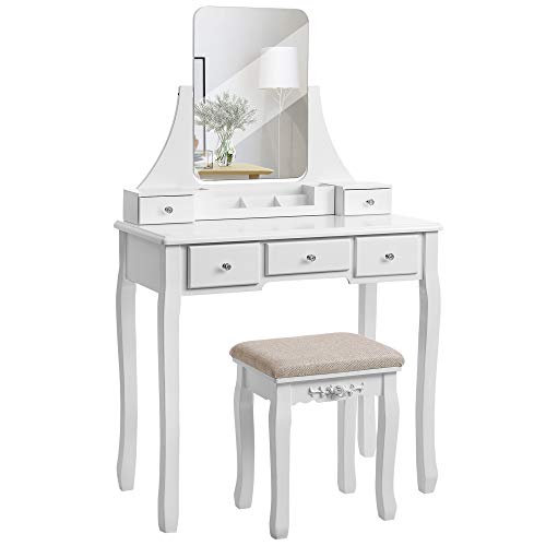VASAGLE Tocador moderno, Mesa de Maquillaje en MDF y Pino, con Espejo sin Marco, con Caja Móvil, Taburete de Madera de Goma, 5 Cajones, para Dormitorio, Vestidor, Blanco RDT25WT