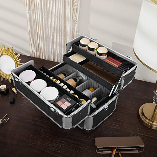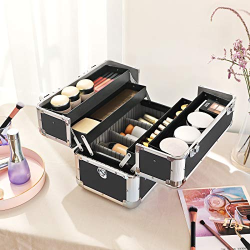 SONGMICS Maletín Moderno para Maquillajes, Caja de Belleza, con 4 Bandejas, Marco de Aluminio, Recubierto de ABS, 36 x 24 x 24 cm, Negro JBC228